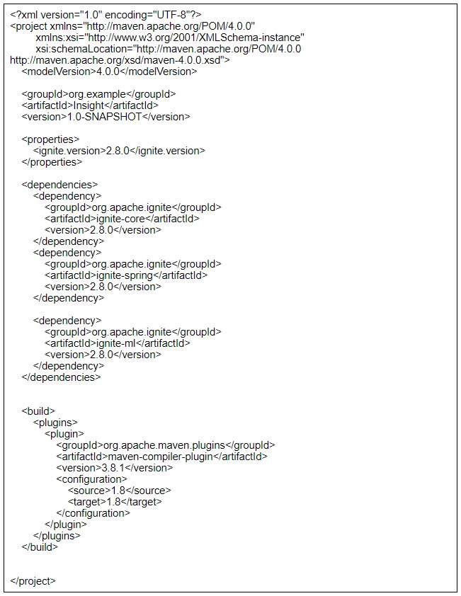 Instead, you just download the framework using a Maven pom.xml file. Then, when you write Java code to do the regression analysis, Ignite launches an instance of itself.