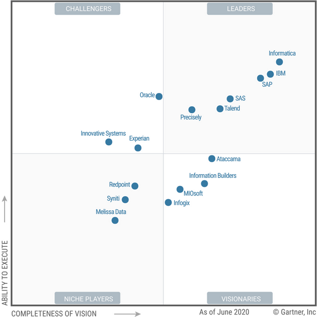 Rounding out the top three vendors in the Leader category is SAP, who actually possesses the biggest market share of any data quality solutions vendor. With its innovative cross-tool integration strategy, SAP aims to provide tighter connectivity among its data management capabilities, including: