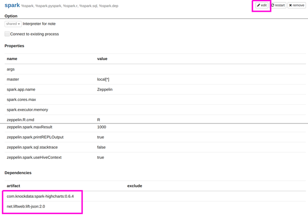 The other alternative is to add these artifacts to the Zeppelin Spark interpreter for Zeppelin that you already have installed. What you are telling Zeppelin here is to reach out to Maven Central and download the Java code you need to make HighCharts work. (Plus it requires lift-json).