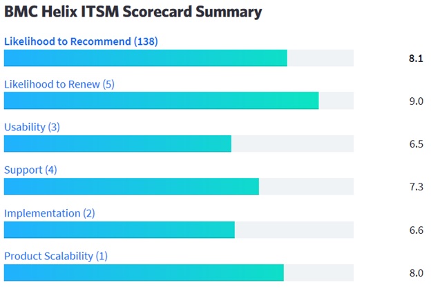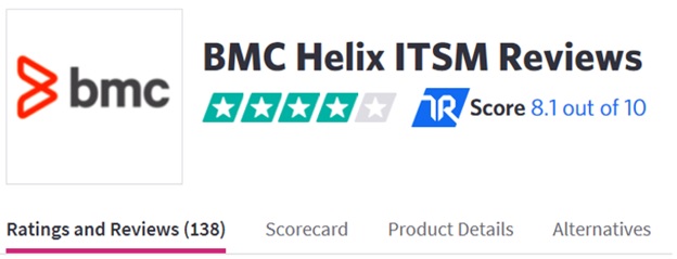 BMC Helix ITSM scores an average of 8.1 stars out of 10, based on 138 user ratings and reviews on TrustRadius.