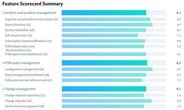 The Features Scorecard Summary, an aggregate of the user reviews, indicates that BMC Helix ITSM scored the highest for its expert directory, configuration management, and change calendar.