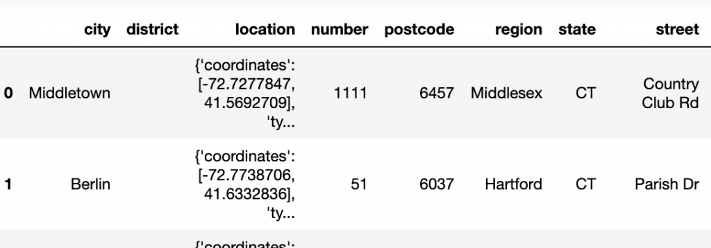 { "state": "CT", "postcode": "06037", "street": "Parish Dr", "district": "", "unit": "", "location": { "type": "Point", "coordinates": }, "region": "Hartford", "number": "51", "city": "Berlin" }