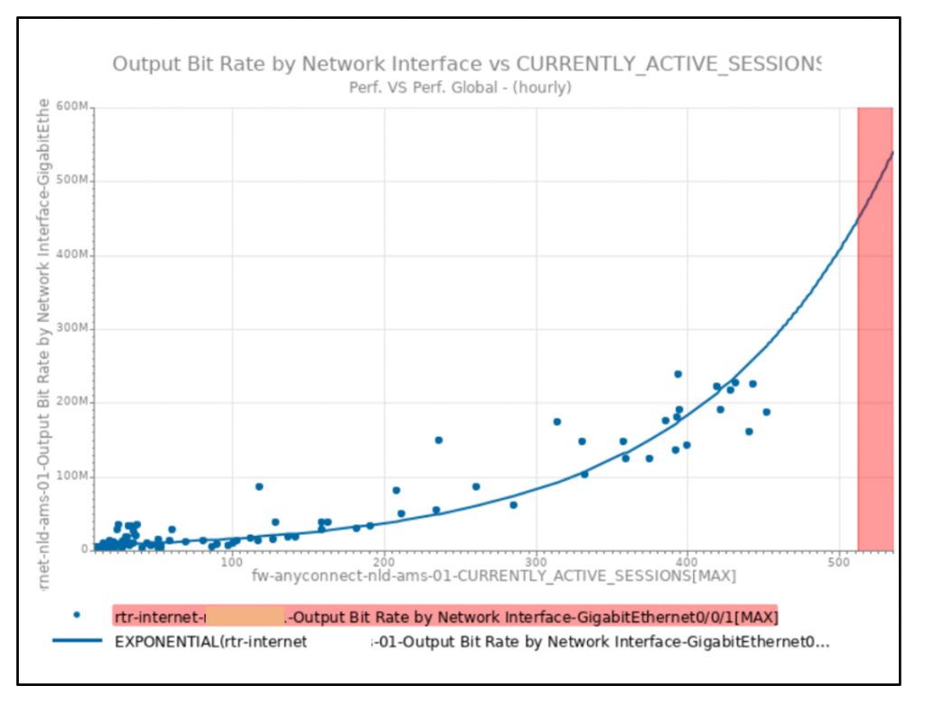 You also want to look at the correlation between active sessions and output bit rate by network interface. This allows you to determine when the circuit will saturate based on the trend for growing number of sessions and current bandwidth.