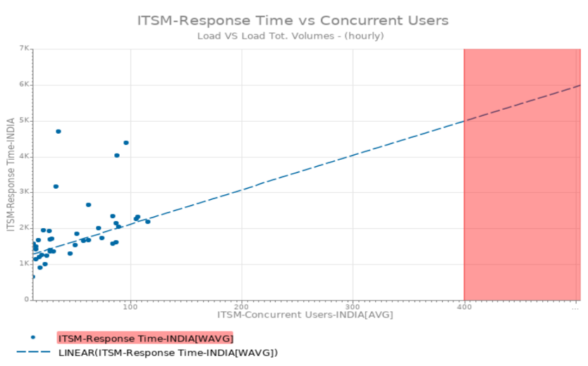 In the chart below we show that you can add up to 400 users and still maintain current response time. It is important to rerun this model periodically to see if this correlation holds true over time.
