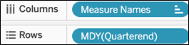 Then drag Quarterend date to Rows, since we want financial data by date. Format the date show that is shows the full date. Tableau tends to collapse that to year, as it assumes we want to do aggregation. (That's logical since, in most cases, you want a report to sum data. In this case, we want the report to show all the data.)