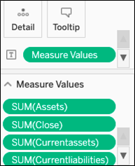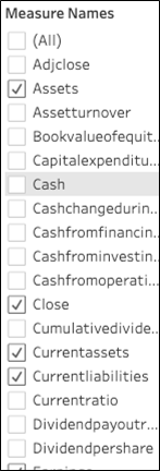 Add the Measure Values to the filter tab and then deselect fields until you have what you want to see. For financial analysis that would be the balance sheet values assets, liabilities, and cash and profit and loss value earnings.