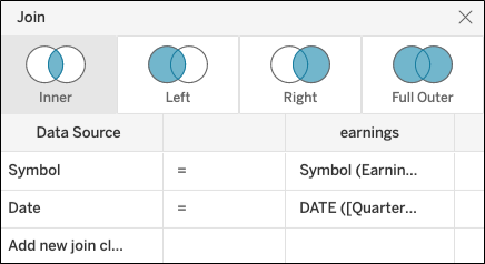 So, we’ll create a calculated field to join the two tables, which adds a new field to the earnings table that will match a field in the price table. (Of course, that means we will lose data for those Mondays which are a holiday. You could, as an exercise, try to fix that.)