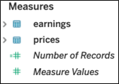 In the worksheet view you see the both tables: earnings and prices. The easiest way to make a crosstab table is to drag measure values onto the Text mark.