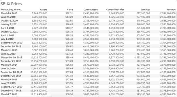 Download the data we are using from here. There are three tables in that zip file: price, earnings, and dividends. We will look at price and earnings. Set a filter to extract only SBUX.