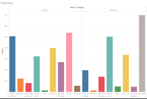 Here is a finished expense report for the months of January and February. If you want a graphical report, like this bar chart, then listing one month next to another is one option.