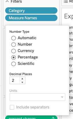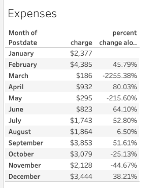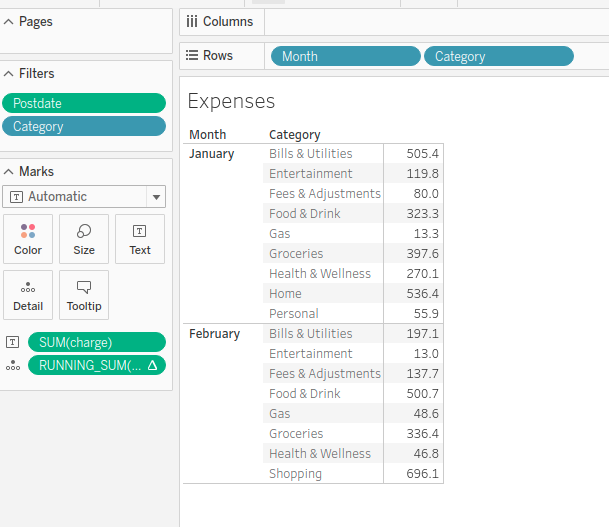 By default, Tableau will assume that we want a report of expenses by month (first) and category (second) since we listed month on the left and category on the right. It adds the function sum() to the amount since it assumes we want to aggregate that.